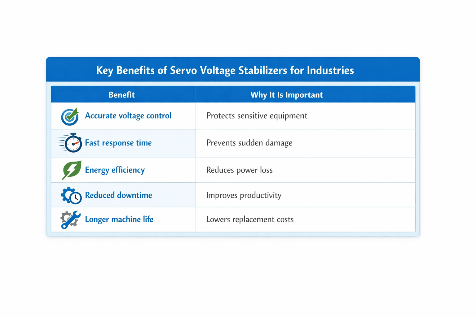 Industries prefer servo stabilizers because they are designed for continuous operation, high load handling, and precise voltage regulation. Unlike conventional stabilizers, servo stabilizers can handle wide voltage fluctuations without affecting machine performance.